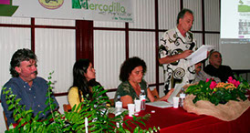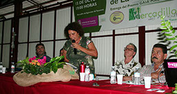Antes de la entrega del premio se presentó el proyecto de la Asociación para el Desarrollo de la Permacultura (ADP), cuyo Centro Especial de Empleo Finca El Mato fue calificado en 2012 como Buena Práctica por el Programa HABITAT de las Naciones Unidas. Con este fin intervinieron Javier Reyes Barroso, fundador y presidente de la ADP, Juan Sánchez García, profesor de economía aplicada de la Universidad de La Laguna (ULL) y colaborador de la ADP, y Sonia Díaz Méndez, “agricultora en prácticas” y alumna del curso interdisciplinar de la ULL cuyo primer módulo se impartió en la Finca El Mato, a principios de septiembre. Intervenciones que permitieron hacer un breve  recorrido por un proyecto que planta su semilla hace diecisiete años, con Javier iniciando sus prácticas permaculturales en la Finca El Mato; Juan, conociendo el lugar y los proyectos hace menos de cuatro años; y Sonia, recién encontrándose con la finca hace seis semanas como alumna del mencionado curso de la ULL, experiencia que volcó en una sentida reflexión que tituló “Cultivando personas” que compartió con el público y que transcribimos al final de esta noticia. Javier, Juan y Sonia felicitaron a las Mujeres del Mercadillo del Agricultor y agradecieron la invitación a los organizadores.