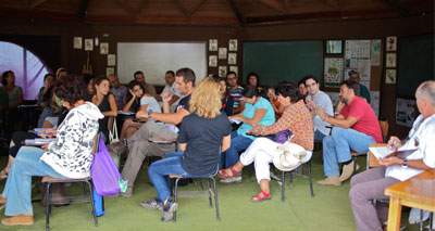 Toda una entrañable experiencia: se trató de un curso de 38 personas, de edades comprendidas entre los 63 y 21 años –todo un buen caldo de cultivo para el diálogo intergeneracional-, con variado perfil profesional, e importante tasa de paro. Hablamos de agricultores y agricultoras; de gente del mundo de la educación ambiental, horticultura terapéutica, biología sanitaria, gerencia de empresa y organizaciones empresariales, consultor de ingeniería, del mundo de la construcción, de la artesanía, del mundo de la cocina, de Trabajo social, trabajadoras autónomas…;de personas de distintas licenciaturas e ingenierías (ciencias ambientales, derecho, sociología, economía, ingeniería química, ingeniería telecomunicaciones, ingeniería industrial, ingeniería técnica agrícola, ingeniería agrícola y del medio rural, aparejadores, biológicas,…); estudiantes de Geografía, Contabilidad y Finanzas, Filología Inglesa, Ingeniería Técnica de Obras Públicas (Hidrología), Pedagogía; gente del mundo de la enseñanza (maestra, profesorado universitario de Matemáticas, Derecho y Economía).