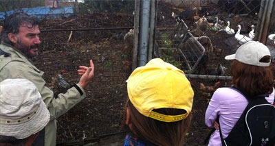 Y así describe su experiencia en la Finca El Mato: “En la Asociación para el Desarrollo de la Permacultura del Centro Especial de Empleo Finca El Mato se reconduce la permacultura del aprovechamiento multidisciplinar de una parcela de 10.000 metros cuadrados para llegar al huerto-mandala en busca del diagrama del macro y micro equilibrio de la fecundidad para salud del parque temático-terapéutico y centro especial de empleo para personas con discapacidad psíquica que alberga. En aras de la divulgación, este proyecto integral dispone de un centro de convenciones y congresos, bioconstrucción de gruesas paredes de barro y paja. Para la salud de gallinas, patos, curieles, cabras, ovejas, cochinos, pavos y conejos, está dotada de granja con charca donde conviven en armonía diecisiete especies (en un corral reconvertido en macrobiocompostera en la que cada día hay recursos que triturar, digerir y transformar). Los equinos, aparte. Centro de reutilización y tratamientos de excedentes (borras de café y otros residuos orgánicos de bares y restaurantes de la zona, aparte de los desechos de la vendimia), transmuta periódicos y cartones en materia orgánica al integrarlos directamente a los acolchados de su suelo. Biotopos, setos arbóreos y de arbustos para la protección de los vientos, una alta estructura de palés colonizada por tres plantas de fruta de la pasión (parchita) para arropar las colmenas y controlar el tráfico aéreo de las abejas, por seguridad y para que no se sientan intimidadas por el devenir de la cotidianidad de las labores de trabajo en el huerto, y mucho más en la finca El Mato: el ingenio agudiza el estudio. Uno de los apoyos económicos externos del centro, las más de veinte familias comprometidas que adquieren por quince euros una caja de verduras y frutas de cinco o seis kilogramos de peso. La iniciativa incluso cuenta con voluntarios llegados del extranjero, quienes conviven y laboran temporalmente en el complejo, gracias a programas internacionales de cooperación. Riegos simulando lluvia en un suelo riquísimo en materia orgánica donde proliferan lombrices no surferas, sino unas con el pedigrí plagado de gusanos guanches ancestrales. El respeto al medio ambiente encuentra en este asentamiento humano plantado en sistemas armónicos y simbióticos un ejemplo de alma, corazón y vida. Los profesores, Carlos Martínez y Carlos Garrido oficiaron las correspondientes eco-agro-homilías para introducir en el acercamiento al tema a los alumnos que ya se saben agricultores (sea de facto, por afición, acción, omisión, necesidad o vocación)”.